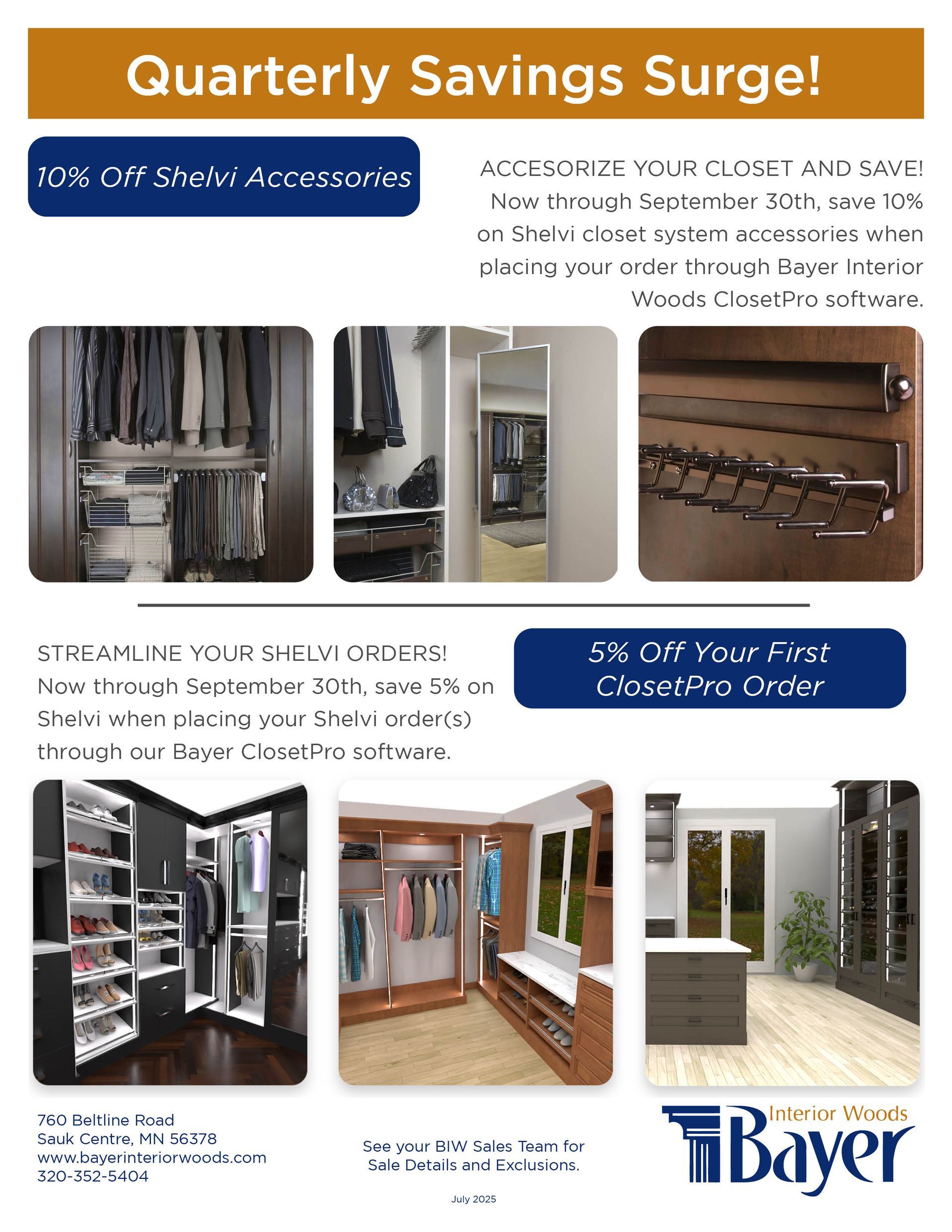 Bayer Interior Woods is proud to announce a new strategic partnership with ClosetPro, a leading design software for custom closet and storage systems. This collaboration marks a significant step toward streamlining quotes, and elevating design capabilities for both residential and commercial markets. Through this partnership, ClosetPro will integrate BIW’s ShelVi Closet Systems—renowned for their durability, beauty, and sustainable sourcing—into its custom closet systems. The collaboration will allow Bayer Interior Woods customer the ease of designing and pricing ShelVi Closet systems through ClosetPro. BIW’s wide range of standard finishes, textures, and custom design options, give customers unparalleled flexibility and craftsmanship in their storage solutions. Bayer Interior Woods will benefit from ClosetPro’s quick design features and rendering capabilities. ClosetPro renderings offer the end user full visualization of their project and finish color options. “This partnership gives our dealers the ease to create exceptional closets on demand for their consumer” said Brian Bayer, Founder and CEO of Bayer Interior Woods. “ClosetPro’s design leadership and ease of use perfectly complement our customer commitment while aligning with our customization and craftsmanship.” The partnership officially launches in May of 2025, with design catalog availability through ClosetPro and pricing to follow in June of 2025.