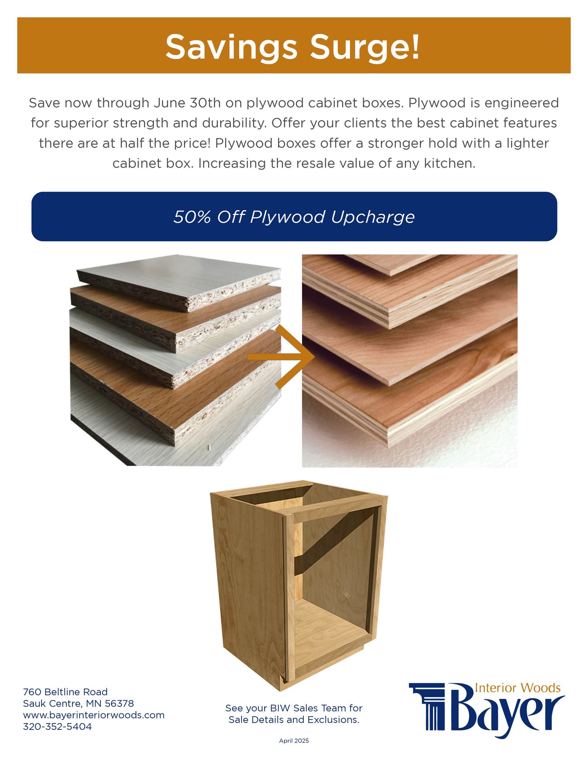 The savings are here! For a limited time save on plywood cabinet boxes! Plywood is engineered for superior strength and durability. Offer your homeowners the best cabinet features there are, at half the price!